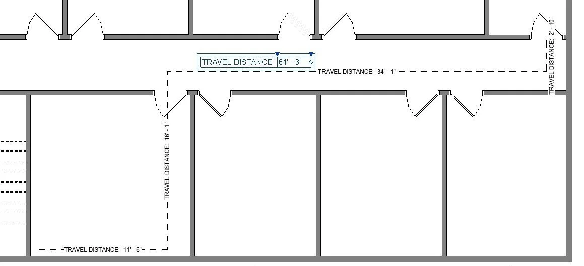 The main benefit of the Path of Travel tool is the Travel distance is recalculated automatically based on floor plan changes. Which is a considerable time saving deal when processing multiple design iterations across several/large projects.