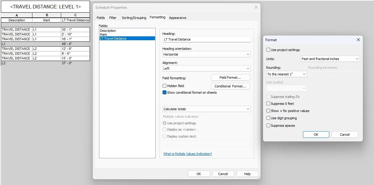 Lastly, we need the schedule to automatically calculate total travel distance. To do this, under the Fields tab, highlight the LT Travel Distance parameter and set the schedule to calculate totals. Also, select Field Format… and adjust the units format to match project requirements. (We use rounded to the nearest inch as mentioned earlier in the tag family section.)