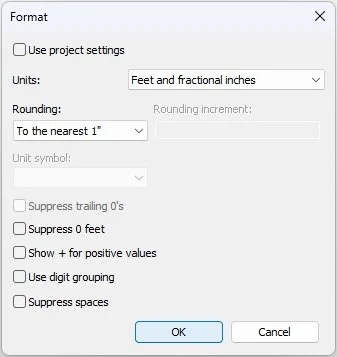 We want the format to show rounding to the nearest inch instead of defaulting to the project settings. (The units can be set to municipal standards, but most authorities I have dealt with only want to see to the nearest inch.) Once complete, hit OK to close out the dialog, save the file, and load into the project.