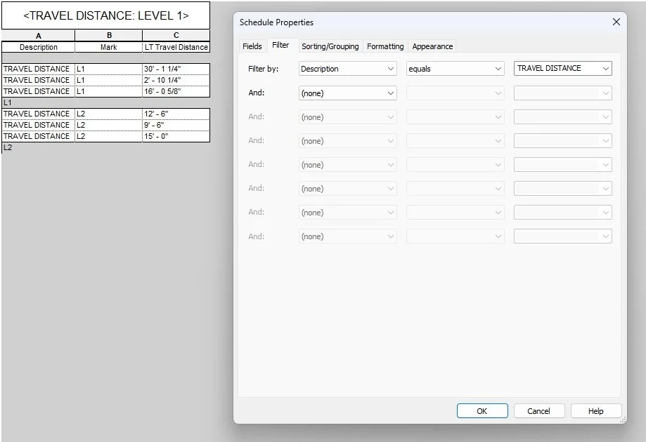 Once the schedule is generated it will populate with all instances of detail items in the project. To filter out what we need we set the filters by the Description parameter with the label Travel Distance.