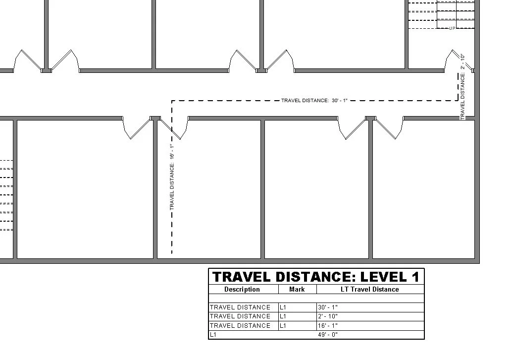 Since projects can require multiple paths of travel, users can also group the schedule by Mark. This will require users to manually set the Travel Distance Mark parameter. (We set the group of lines used to calculate the total distance with the same label. Revit will pop up a warning on duplicate Mark but you can ignore this. If users wish to avoid these warnings, simply use a naming scheme like 1.2, A-1, etc. and set the filter appropriately.)