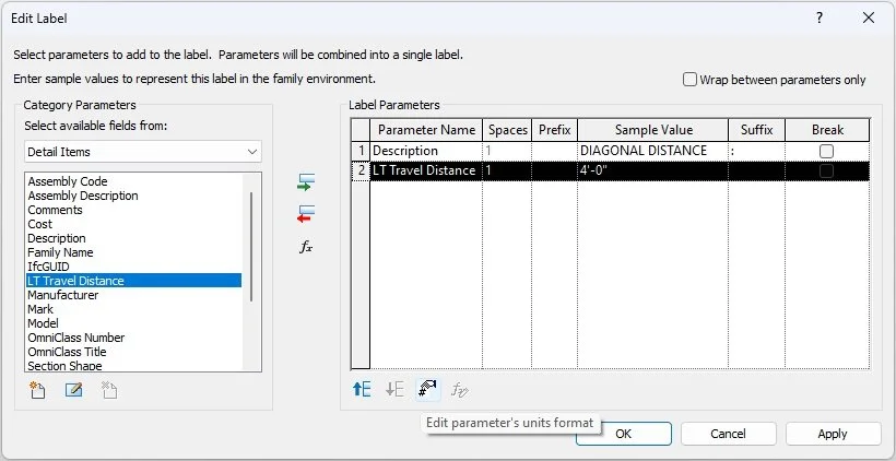 Inside the Edit Label dialog, we need to add two parameters: Description and our LT Travel Distance shared parameter. To add the shared parameter, select New Parameter in the bottom left of the dialog. Click Select…, highlight LT Travel Distance, hit OK to close the dialogs. Next add the two parameters to the Label Parameters window and provide sample values to match our example.